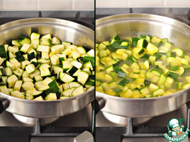 В сотейник налить 3 ст. л. оливкового масла, обжарить цуккини, залить кипящей водой - 750 мл, посолить, дать закипеть и потушить немного, минут пять.