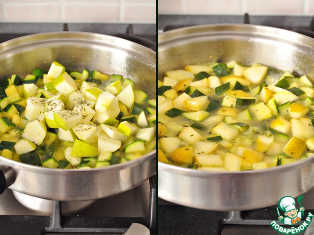 Затем к цуккини добавить нарезанные яблоки, сушеный тимьян, потушить 4-5 минут, до мягкости яблок.