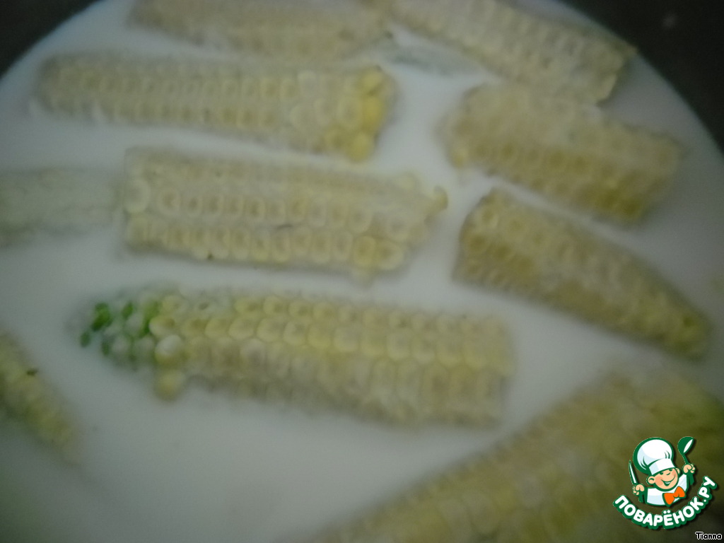 Сами початки поломать на несколько частей и положить в кастрюлю с молоком. Поставить на средний огонь и довести до кипения. Затем огонь уменьшить и варить около 8 минут.