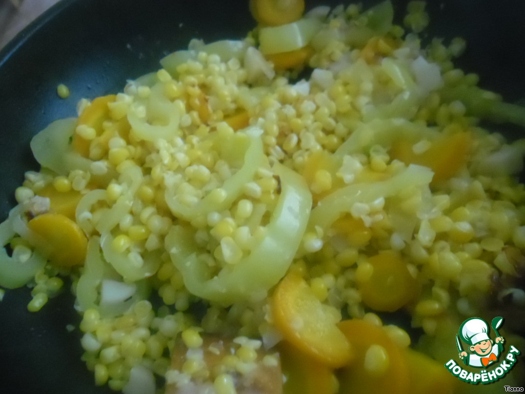 Масло разогреть в сковороде. Выложить туда лук и обжаривать минуты 3. Затем добавить морковь, перец, чеснок и кукурузу. Посолить и поперчить. Тушить под крышкой 5 минут.