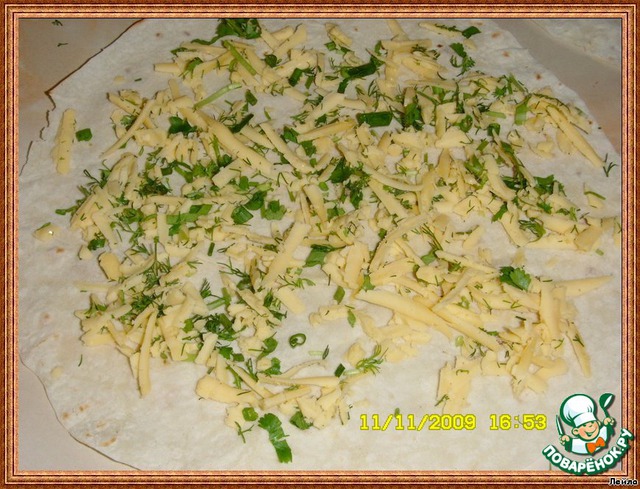Равномерно посыпать лаваш, плотно свернуть в ролл,