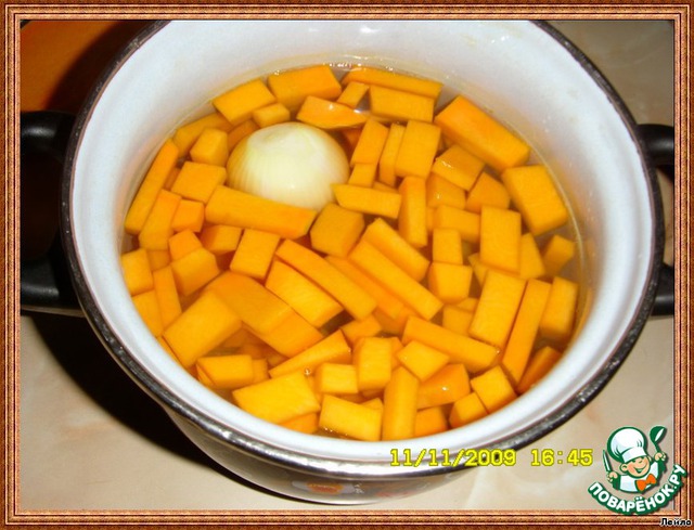 Затем луковицу вынуть, тыкву спюрировать в блендере, добавить немного жидкости.