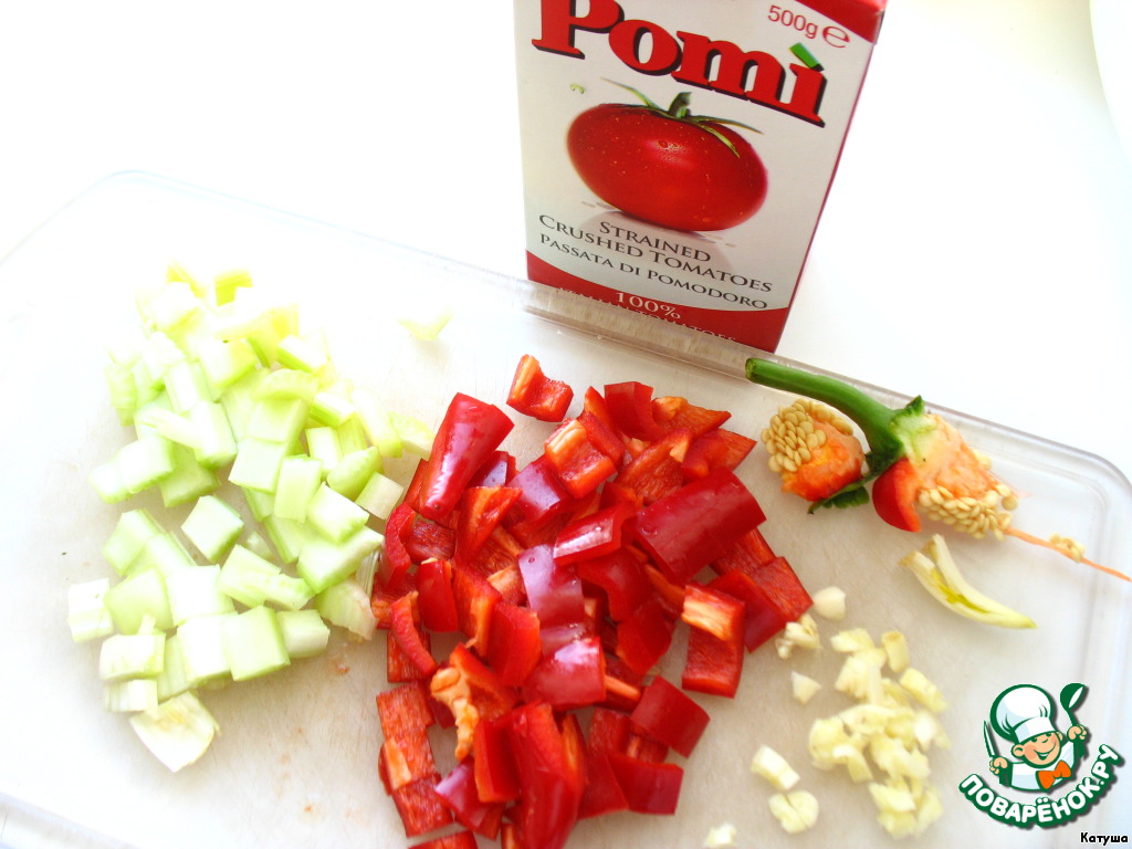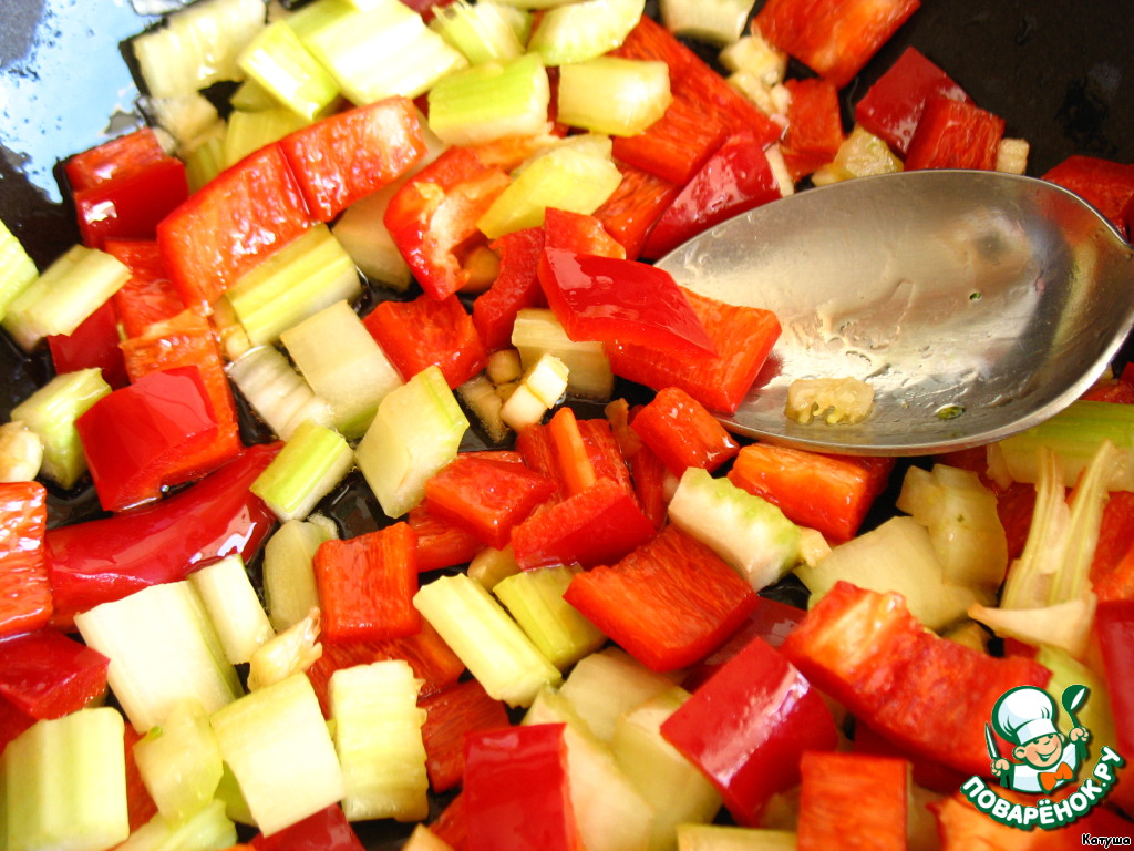 А пока наши зелёные овощи тушились, мы нарезали перец, один черешок сельдерея, раздавили чеснок, убрали серединку и мелко нарезали.