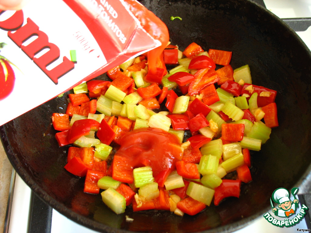 Добавили томаты. Тут есть нюансы - я брала POMI (500 мл), у этих томатов самый подходящий вкус - сладкий. Если они недоступны, то: