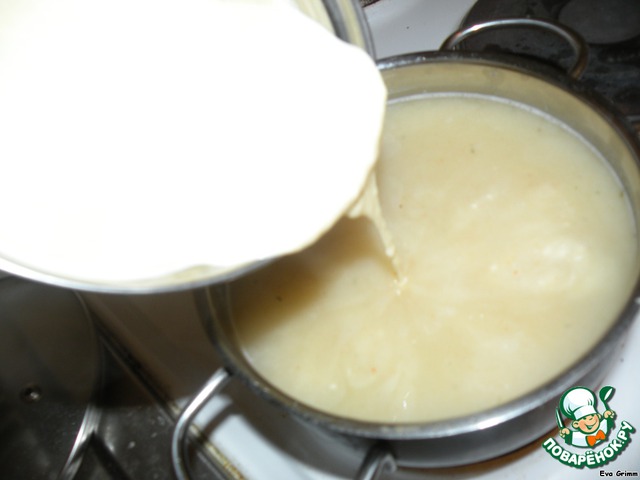 Вливаем сливочно-сырную смесь в капустный супчик *DANCE*, держа бульон на медленном огне... Посолить по вкусу...