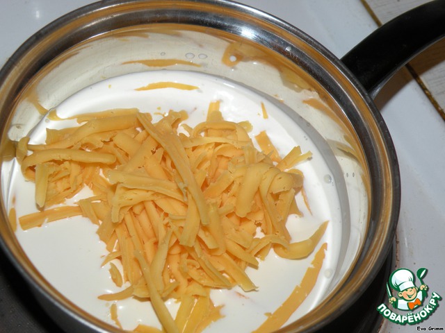 Сливки разогреть, но не кипятить, растворить в них сыр (натереть на крупной терке).