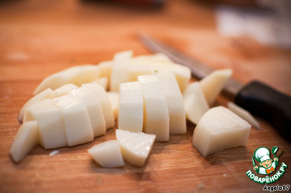 Картофель нарезать так же на равные части (немного мельче, чем ломтики цуккини, т. к. картофель дольше вариться).
