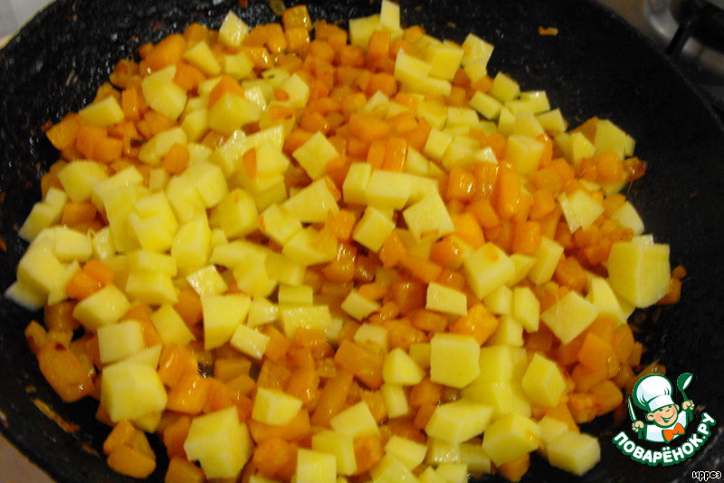 Добавить кубики тыквы, спустя 10 минут кубики картофеля, и слегка потомить около 5 минут.