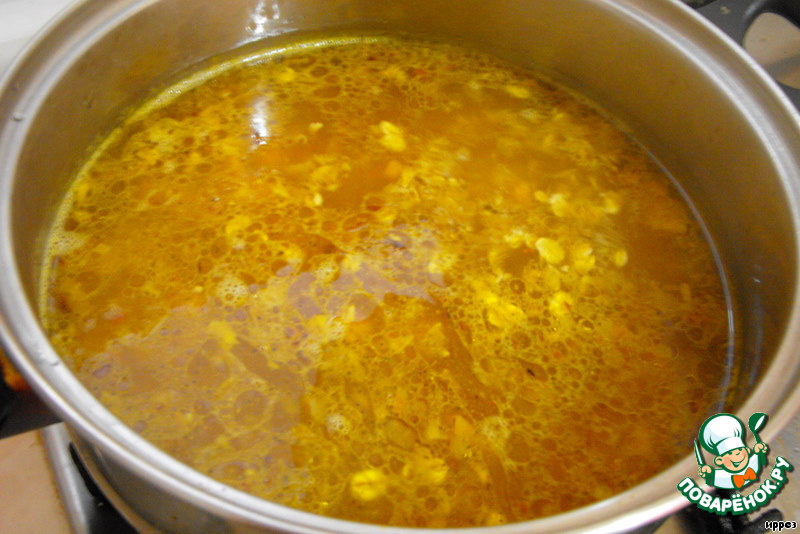 Добавить овсянку, перец, карри и паприку. Оставить кипеть на небольшом огне около 15 минут.