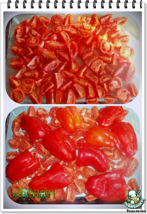 На помидоры выложить половинки перца и также приправить их, как и помидоры. Поставить в духовку минут на 20-30 мин. при Т* примерно 150*С.