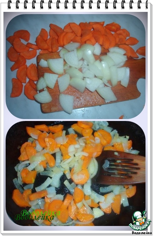 Тем временем займемся морковкой и луком. Лук и морковку нарезать небольшими ломтиками потоньше. Обжарить на растительном масле до золотистого цвета, добавить 1-2 ст.л. воды и тушить на маленьком огне, прикрыв крышкой, минут 15 или почти до готовности морковки.