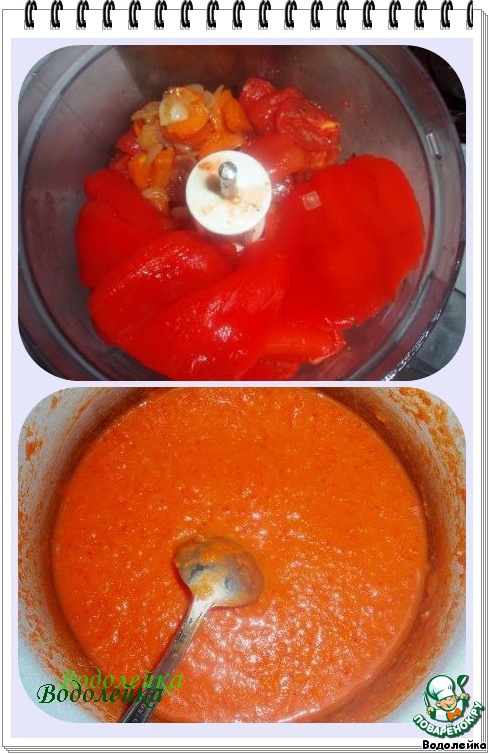 Вынимаем овощи из духовки. И все (перец, помидоры, лук и морковку) перекладываем в блендер (с перца предварительно снять кожицу) и хорошо измельчаем.