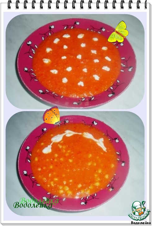 | Вариант такого супа я увидала в журнале. И мне понравилось то, что здесь не добавляется вода, бульон или бульонные кубики, что присутствует во многих рецептах на сайте (я перед выставлением просмотрела). Супчик получается немного густоватым, с выраженным вкусом помидоров и перца. |