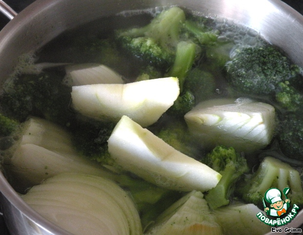 Брокколи и лук выкладываем в холодную воду (воды примерно столько, чтобы закрывала овощи), как только закипит, добавляем яблочко, даем покипеть минут 10.