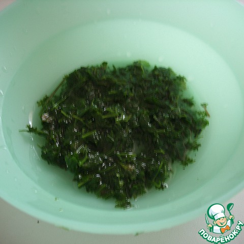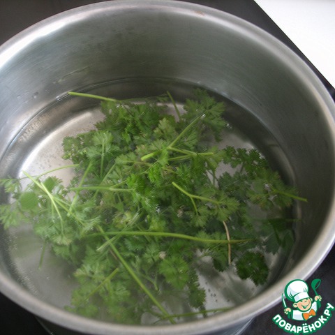 Тем временем можно заняться соусом. В кастрюле довести до кипения воду, добавить петрушку без грубых веточек (50 гр), дать покипеть 5 минут. Сохранить 30 мл отвара.