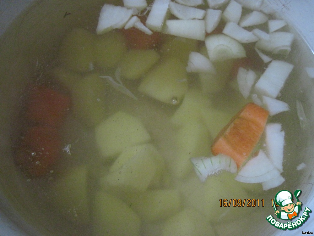 В кипящую воду бросить лук, морковь, картофель, пусть поварятся немного,