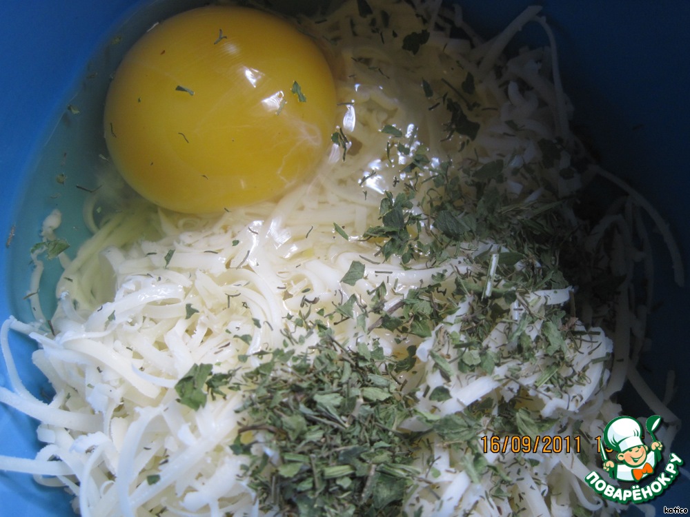 Пока суп закипает, приготовим чесночный омлет: соединить вместе яйцо, тертый сыр и 0,5 чайной ложки густой сметаны, хорошо размешать, добавить сухую зелень и перец,