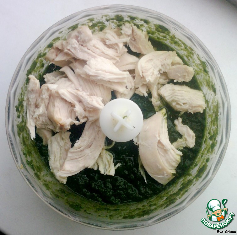 В блендере взбить отваренный шпинат и грудку до состояния кашицы
