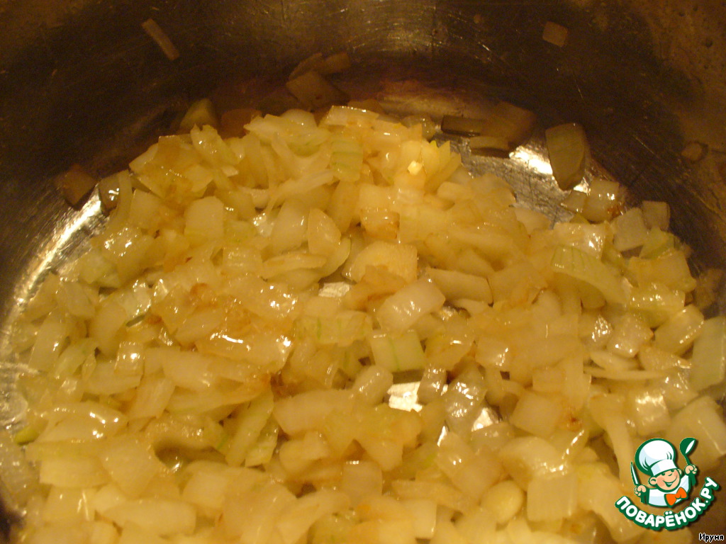 Лук чистим, режем мелкими кубиками. В кастрюле разогреваем масло, обжариваем, помешивая, лук до прозрачности и легкой золотистости. Не даем ему пережариться!