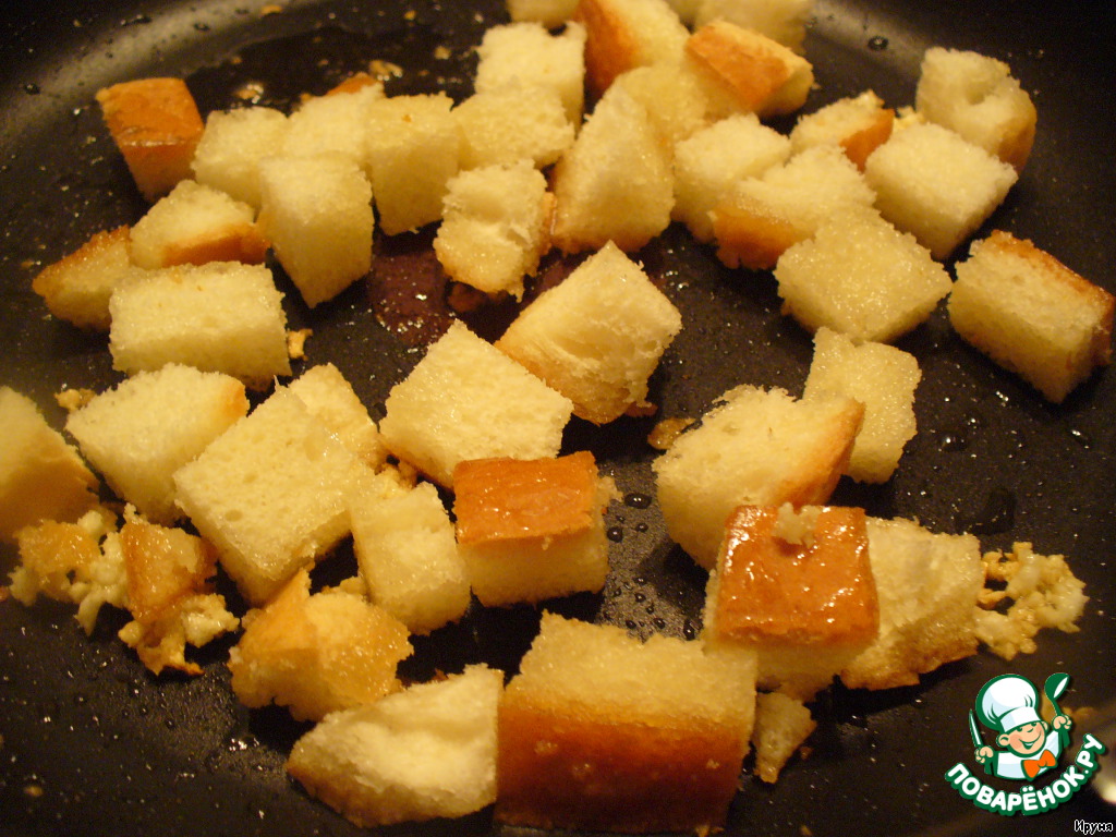 Пока варится суп, займемся гренками. Нарежем хлеб кубиками, чеснок мелко рубим (я - лентяйка, поэтому, пропустила его через пресс). Нагреваем немного масла на сковороде, на небольшом огне готовим чеснок 30 секунд, помешивая. Добавляем хлеб и обжариваем его со всех сторон, опять же, помешивая, пока он не станет золотисто-коричневым.