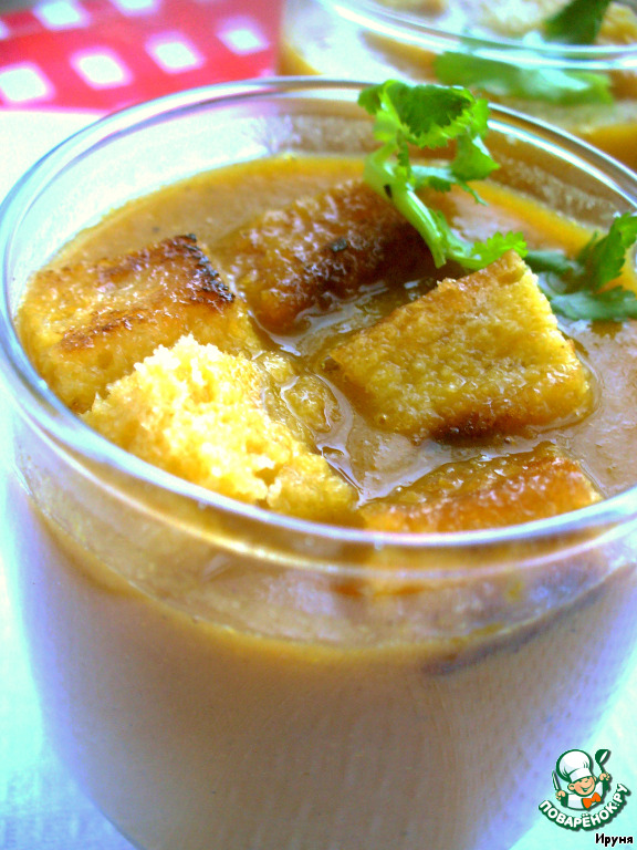 Суп рекомендовалось подавать горячим с гренками и зеленью кинзы в небольших огнеупорных стаканчиках или маленьких мисочках. Что-то подобное я попыталась изобразить )). Приятного аппетита!
