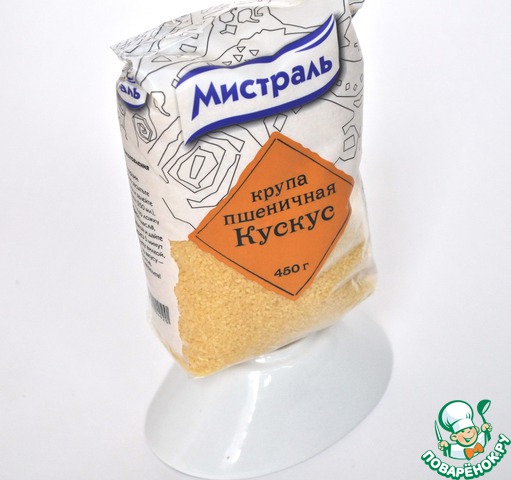 Кускус залить небольшим количеством кипяченой воды. Накрыть плотно крышкой, дать набухнуть минут 5-7.
