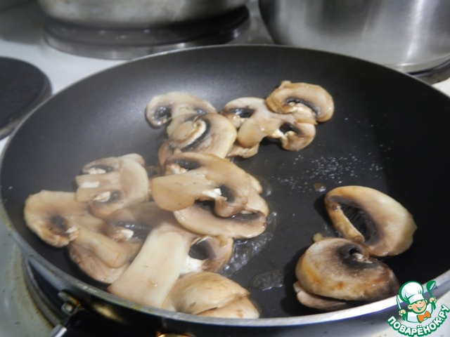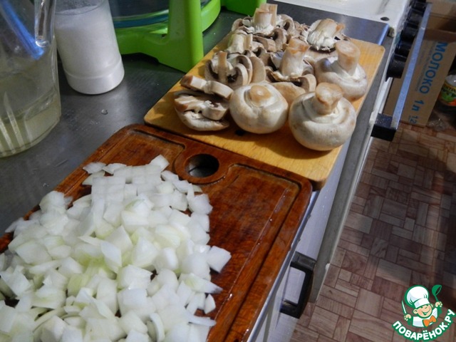 Лук и грибы нарезаем произвольно, но не слишком крупно (пару грибов оставить для украшения)