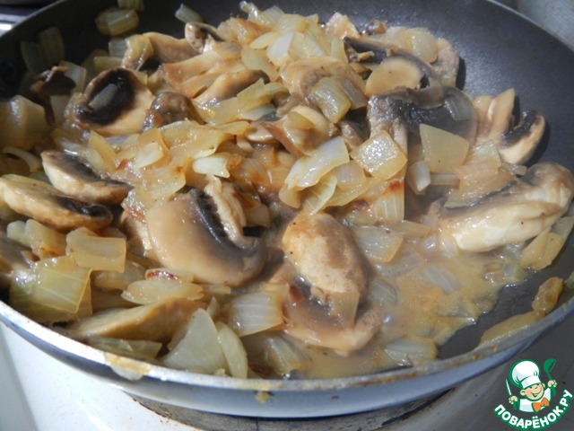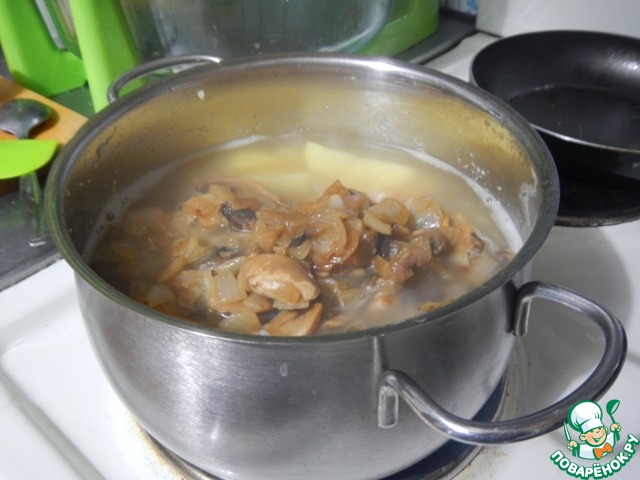 Добавляем грибы с луком к картофелю (ещё раз напомню-воду не сливать!).
