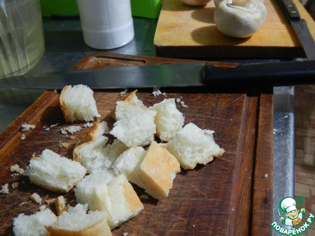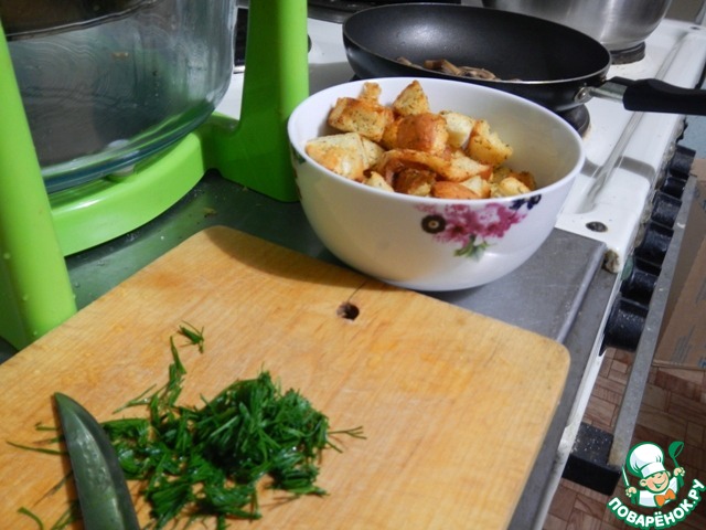 Грибы и гренки готовы, теперь дело за малым:)Нарезаем нашу зелень.