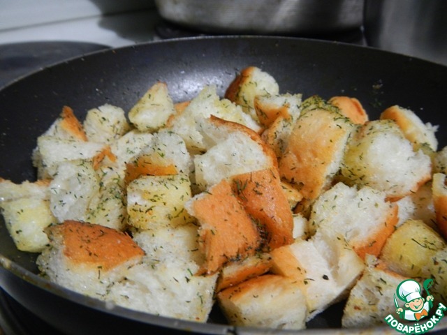 Растапливаем оставшееся сливочное масло и добавляем хлеб. Для вкуса я ещё перчу и добавляю сушёный укроп. Отправляем гренки в духовку (так как у меня духовки нет, я готовлю гренки в аэрогриле при максимальной температуре минуты четыре).
