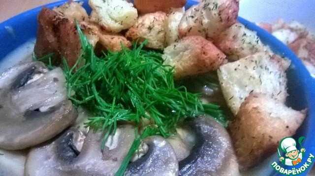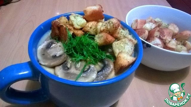 Разливаем наш суп по тарелкам. У меня кружка-супница, мне кажется это придаёт больший уют:)Украшаем грибами, гренками и зеленью.