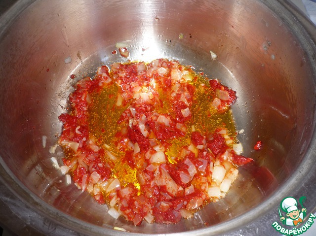 Добавить томатную пасту, перемешать. Продолжить жарить пару минут.