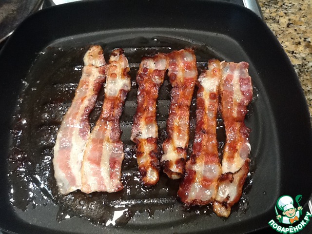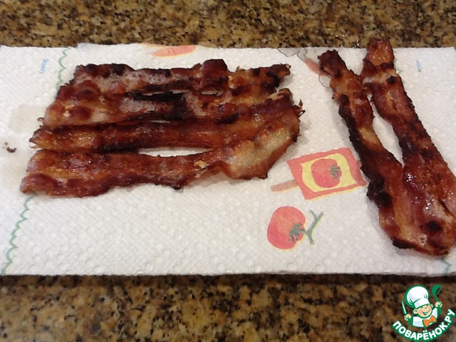 Готовый бекон кладем на салфетку. Нам вовсе не нужен лишний жир! После остывания мелко режем.
