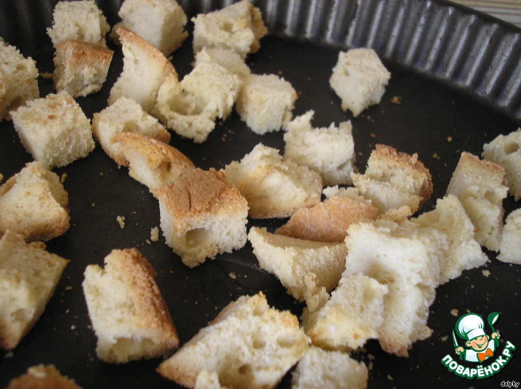 Тем временем приготовьте сухарики. Разогрейте духовку до 180 гр. Я предпочитаю диетический вариант: просто подсушиваю сухарики в духовке.
