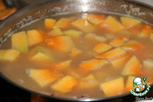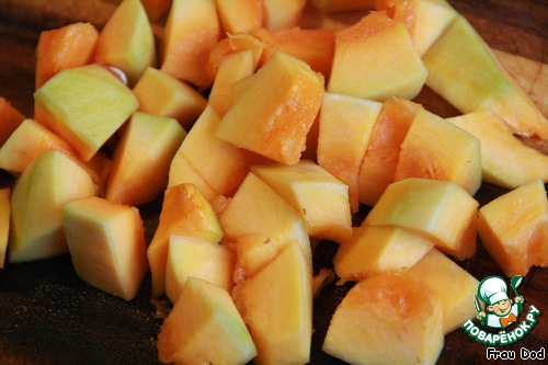 Из тыквы удалить сердцевину, очистить от кожуры и нарезать крупными кусками.