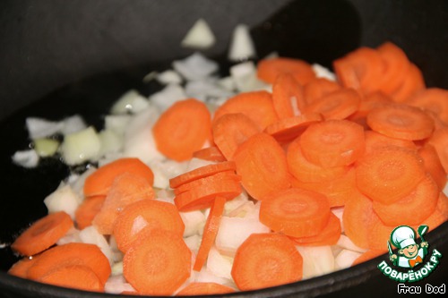 Нарезать морковь кольцами, высыпать лук с морковью в предварительно разогретую сковороду с растительным маслом. Немного пережарить, добавить в суп. Варить еще 15 минут, приправив специями.