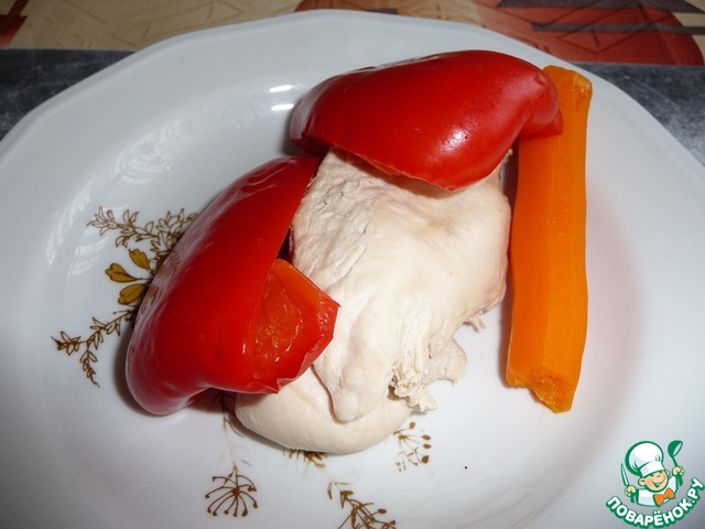 Из готового бульона вынуть мясо, перец, морковь - выложить на тарелку. Лук выбросить.