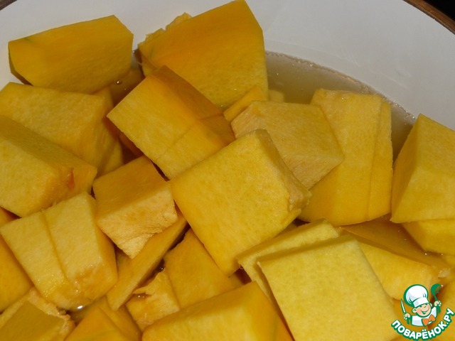 Тыкву почистить, снять кожуру, удалить семечки, мякоть нарезать брусочками среднего размера.