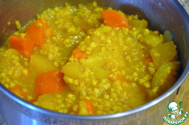 Когда овощи размягчаться, а крупа сварится, разобью всё блендером, добавлю соль по вкусу.