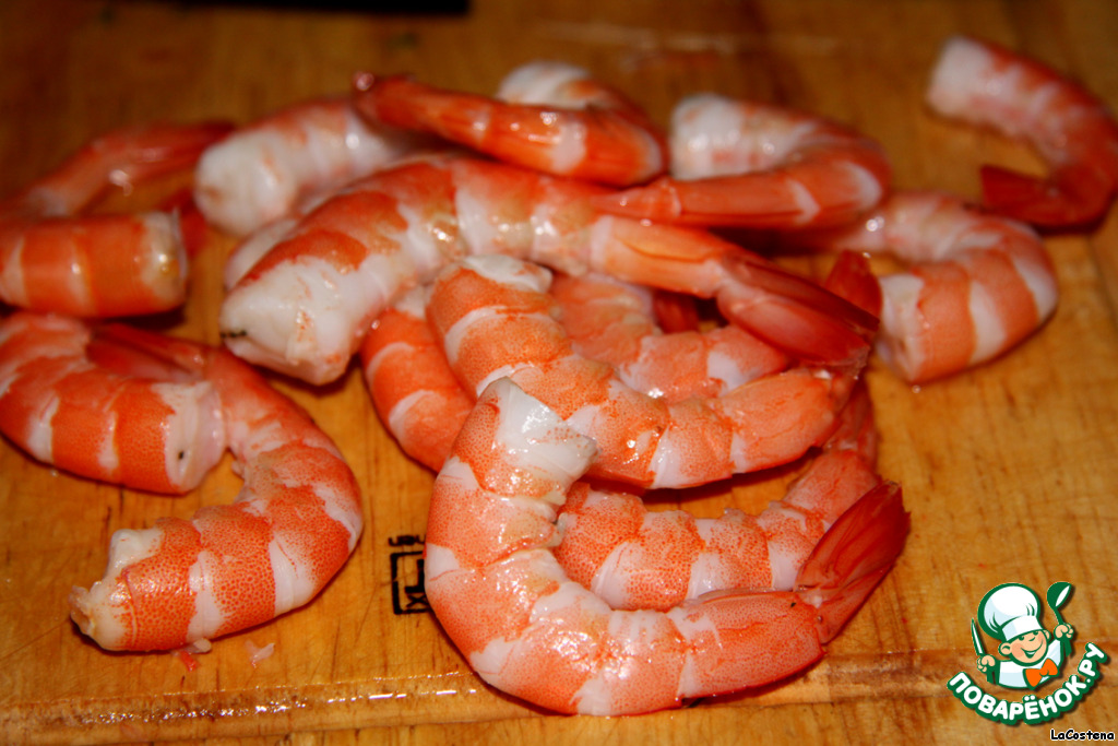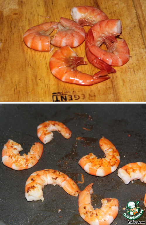 Отложить несколько королевских креветок для украшения. Почистить их и обжарить на оливковом масле.