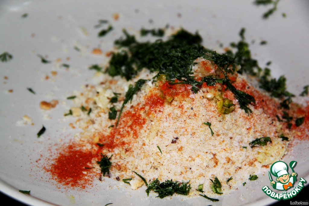 Подготовить панировку: смешать панировочные сухари, укроп, острый перец