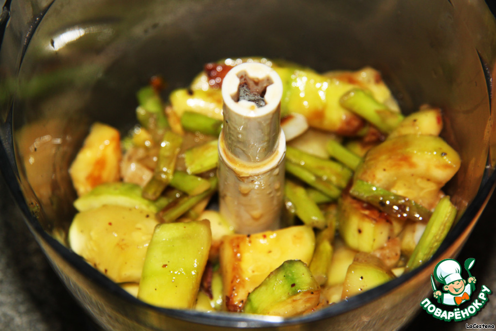 Цукини, спаржу, чеснок выложить на сковороду, посолить, поперчить. Полить оливковым маслом и обжарить минут 5-7.