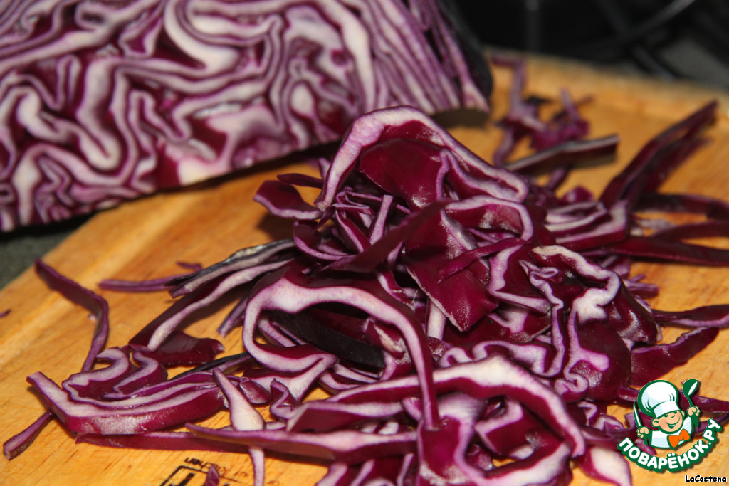 На тарелку выложить нарезанную красную капусту, сбрызнуть ее оливковым маслом и добавить креветки в панировке.