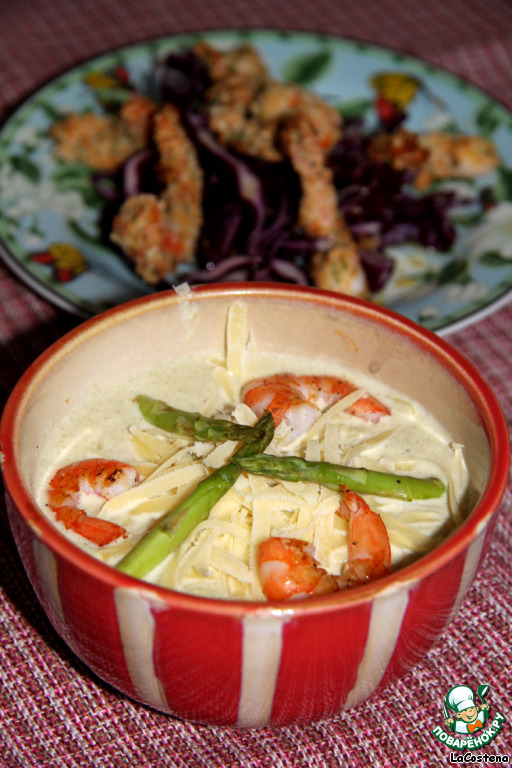Суп перелить в пиалу, добавить сыр, креветки и спаржу. Подавать вместе с креветками в панировке.