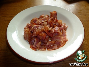 Бекон вынуть, немного промокнуть салфетками от лишнего жира и отложить в отдельной тарелке.