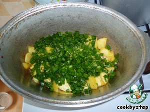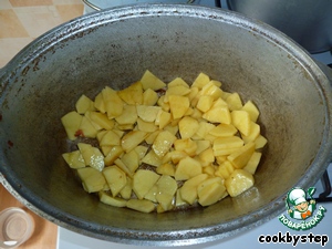 Картофель нарезать среднего размера кусочками и начать обжаривать на вытопившемся из бекона жире.