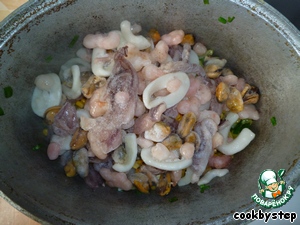 Влить 200 мл сливок. Я использовал замороженные морепродукты, предварительно их не размораживая, поэтому в процессе их приготовления выделилось много жидкости. Если ваши морепродукты не были заморожены или выделили не очень много воды, то ее можно подлить (около 200 мл).