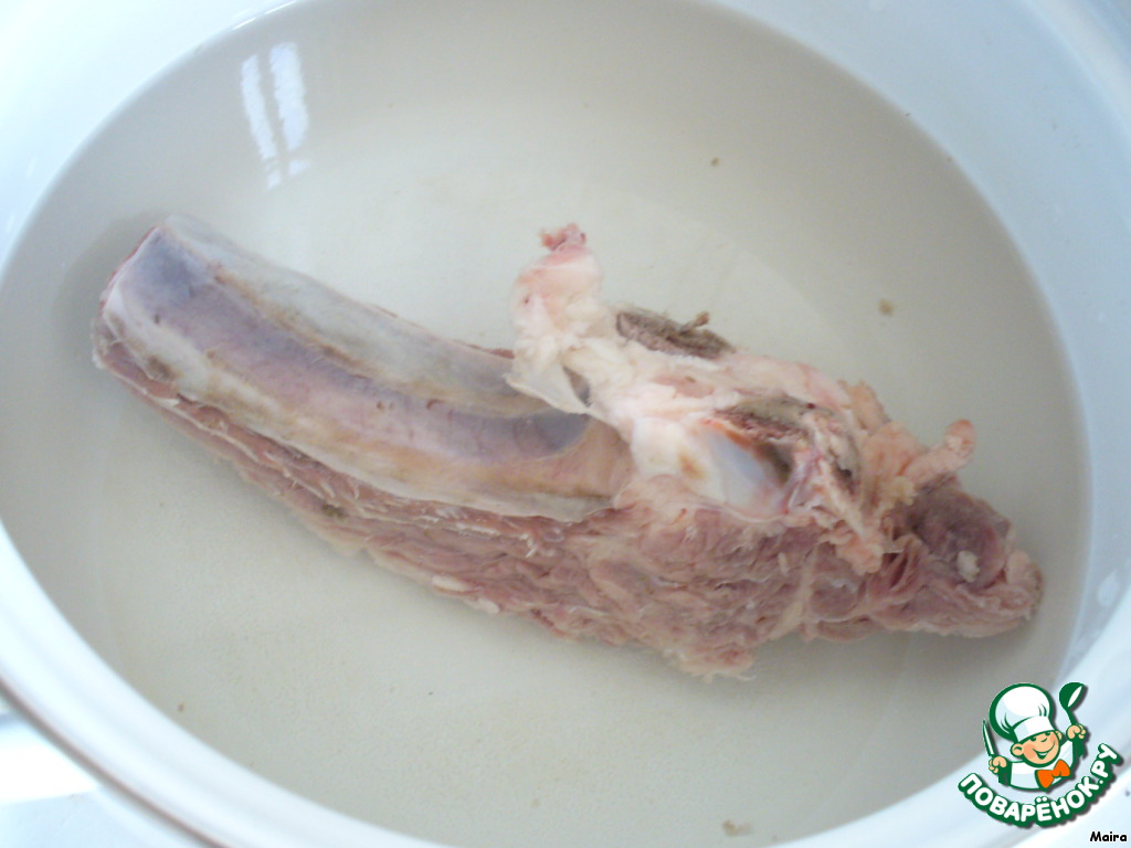 Мякоть отделить от кости. Кость залить водой, довести до кипения, снять пену и варить 1 час. Кость вынуть из бульона.
