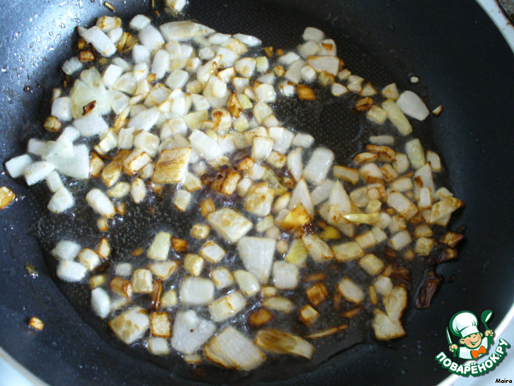 Лук мелко нашинковать, обжарить на растительном масле до золотистого цвета