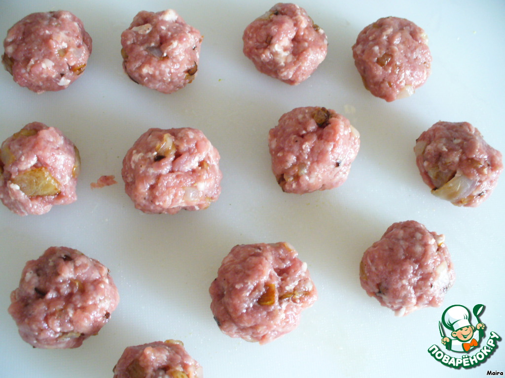 Мясо соединить с луком, посолить, поперчить, сформировать фрикадельки.